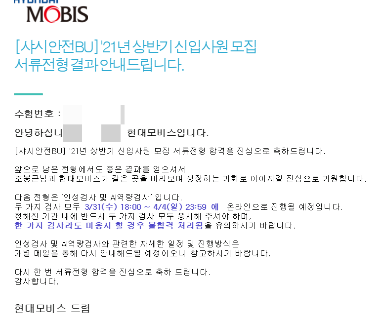 | 현대모비스 취준 후기 : AI인적성, 1차면접, SPA면접, 2차 면접 (5) | 2023.05.22 |