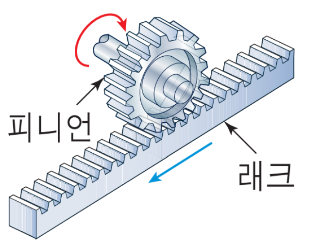 - 랙 & 피니언 > 스티어링 휠의 회전운동을 직선운동으로 변환 > 회전하는 부분 : 피니언 / 직선운동하는 부분을 랙