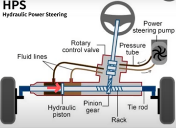 사람 팔의 힘을 덜어주기 위해 펌프를 돌려 유압을 발생시키고 조향 방향에 따라 그 방향으로 유압을 이용해 사람의 힘을 보조. 모터는 엔진의 출력을 사용해서 사용. > 엔진의 출력을 이용하기 때문에 연비가 낮아지는 단점.