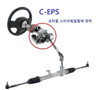 스티어링 휠 아래 부분의 기둥에 모터를 설치한 EPS. 동력전달장치, 현가장치 등 다양한 샤시부품들이 존재하는 프레임이 아닌 스티어링 휠 부분에 모터가 부착되기 때문에 다른 부품간의 간섭이 없어 설치가 용이.
